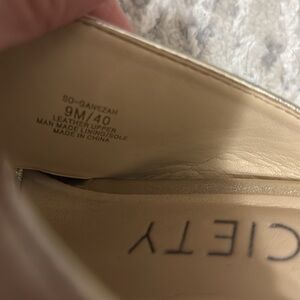 These Sole Society mules feature a chic crisscross strap design in a shimmering gold finish, perfect for adding a touch of elegance to any outfit. The open toe and subtle heel make them versatile for both casual and dressy occasions. Their minimalist style ensures they pair effortlessly with a variety of looks.