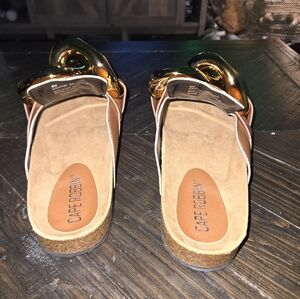 Elevate your style with Cape Robbin's tan mules, featuring a striking gold chain detail. These slip-on shoes boast a smooth leather finish and a flat sole, offering both elegance and comfort. Perfect for adding a touch of sophistication to any outfit. Size 7 women