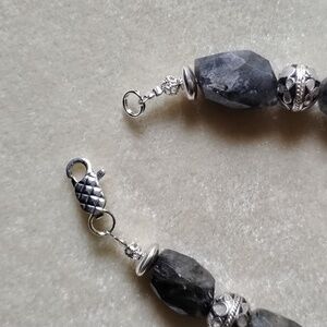 FACETED LARGE GRAY BLUE LABRADORITE BEADS WITH FLASHES OF GREENS AND BLUE. ROUND SILVERTONE BLUE GRAY ENAMEL ROUNDS WITH SILVER ACCENTS. FANCY SILVER PLATED LOBSTER CLAW CLASP. BEST FIT NO LARGER THAN 8 INCH WRIST