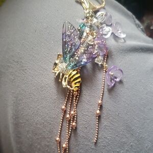 This stunning bag cjatm features a beautifully crafted bee pendant with shimmering purple wings and a gold body. Perfect for adding a touch of elegance to any outfit.