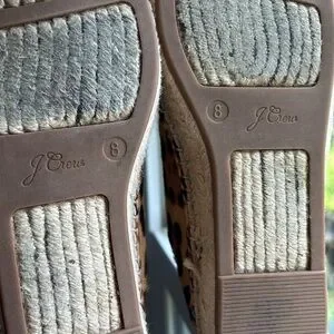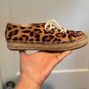 J Crew calf hair lace up espadrille sneakers in Rich Mahogany leopard print in size 8. Fun sneakers! Espadrilles with leopard print calf hair. All aglets in great condition. Some wear, mostly to soles. Leather lining is very soft!