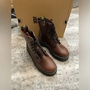 Step into style with these Dr. Martens ankle boots, featuring a rich brown leather upper and a chunky black platform sole. The classic lace-up design and sturdy construction make them perfect for both everyday wear and fashion-forward looks.
