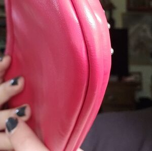 The Nine West Red Wristlet Clutch is a bold accessory with its striking studded design. Made from a leather-like material, it offers a textured and dimensional appearance. Its compact size and convenient wrist strap make it ideal for carrying essentials. In like new condition. minimal wear, has a tiny stain inside.