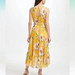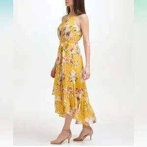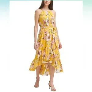 Step into elegance with this vibrant yellow sundress by Vince Camuto, featuring a chic halter neckline and a playful asymmetrical ruffled hem. Perfect for a wedding guest or cocktail event, this sleeveless dress offers a flattering tie front detail and a flowing high-low silhouette. The light, airy fabric ensures comfort and graceful movement, making it an ideal choice for resort wear.