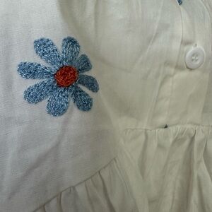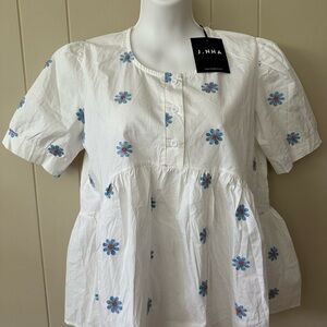 Elevate your summer wardrobe with this charming white floral top from j.nna. Featuring a delightful embroidered blue flower pattern, this top is perfect for any casual outing. The cut is perfectly flattering. Enjoy the comfort and style of this beautifully designed piece.