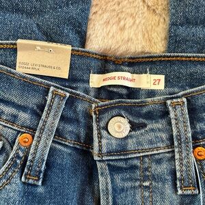 These Levi's jeans feature a straight leg cut in a classic blue hue, perfect for a contemporary look. The denim showcases a medium-to-dark wash with subtle fading and distressed details, adding a touch of modern flair. Crafted with traditional contrast stitching, these jeans embody the timeless Levi's aesthetic.