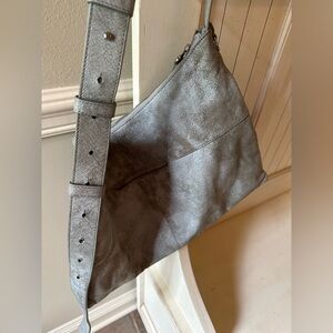 Stylish HOBO crossbody bag. Sleek design. Perfect for everyday use. Beautiful grey metallic sheen, gorgeous leather. Silver hardware, external phone pocket. Key fob, side zipper pocket with tassel. Thick strap. Five interior pockets. 17w by 11h.
