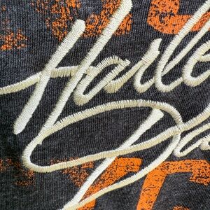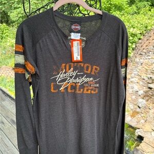 Experience the classic Harley-Davidson vibe with this stylish long sleeve tee, showcasing a dynamic blend of gray and orange. Designed for both comfort and durability, it's an ideal choice for casual wear or expressing your love for the brand. The vibrant color pairing ensures you make a statement wherever you go. NWT