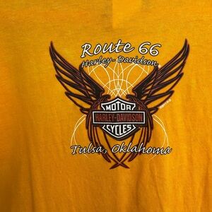 Make a bold statement in this Harley-Davidson long sleeve featuring a deep V-neck and striking winged graphic on the front. The back proudly displays the “Route 66 Harley-Davidson — Tulsa, Oklahoma” logo. Perfect for collectors, fans, or everyday casual wear!