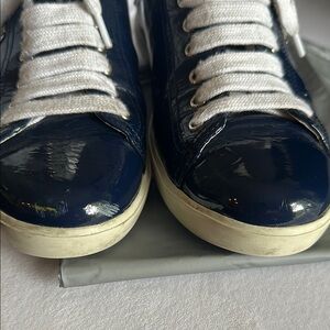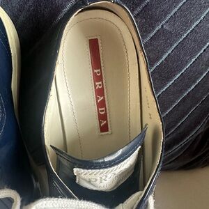 Elegant navy sneakers with cream accents. Classic Prada style. Dust bag included.