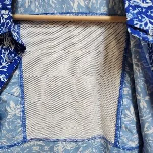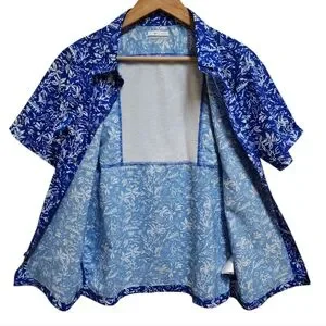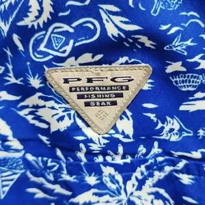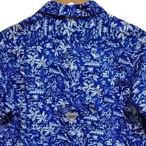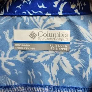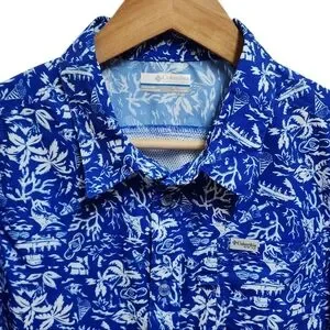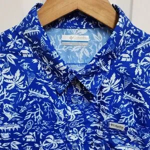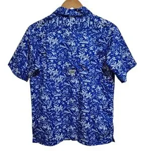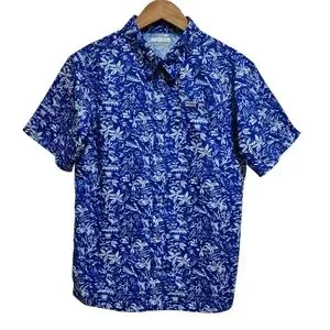 Columbia PFG Shirt Boys Youth XL 18-20 Blue White Floral Hawaiian Short Sleeve Button Performance Fishing Gear Breathable Casual Summer Tropical Palms Beach