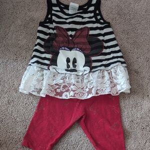 Adorable striped Minnie Mouse top with lace detail. Paired with red pants featuring subtle patterns.
