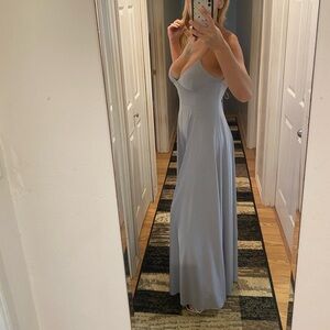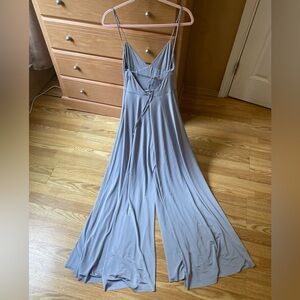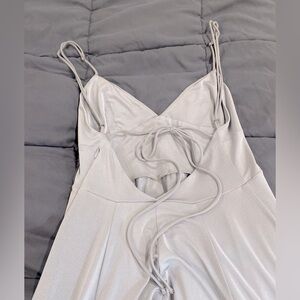 VGUC. Semi formal. Silver//gray with a bit of shine to material. Made in Indonesia. Extra wide leg full length pants romper.Adjustable straps, pull on, with a size zipper. Also has an adjustable tie in the back. Fits to your body. The romper moves with you. Looks almost like a dress on. Factory Raw hem at bottom of pant legs. It’s elegant & flattering. Size Small. ***For reference I’m a size small//US 2. Five foot 6 with heels on in pics. Size 32 E bust. Usually I won’t wear rompers this was comfy, easy to into & no fuss.