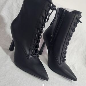 These black heeled boots feature a sleek stiletto heel and a stylish lace-up front, offering a modern twist on a classic design. Crafted from a smooth material, they provide a sophisticated look perfect for formal occasions.