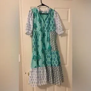 @frugalfoofoo Hi there! Not sure what the material is but almost certain it’s 100% cotton. Length is 44”, ptp is about 16.5, it’s lined and does not have pockets.