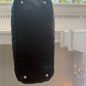 Betsey Johnson travel bag, featuring a quilted design with hearts on the main body and a solid black bottom. The bag has black handles and a decorative black bow with a jeweled charm.