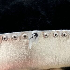 Though interior gold leather lining is quite distressed at top edge and 1 rivet missing