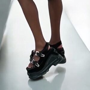 The Medusa Anthem shoe line clashes Mary Jane-in-spired styles with an extra-large moulded platform rubber sole. Tonal Medusa rubber injections at the soles and V-shaped hardware at the staps complete the satin sandals.