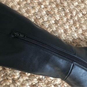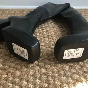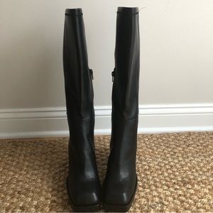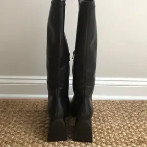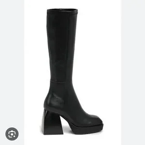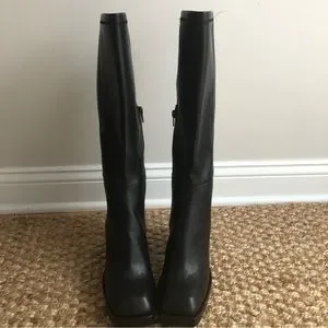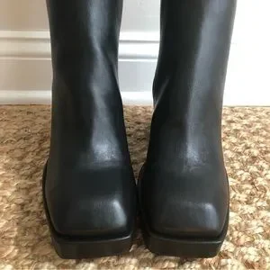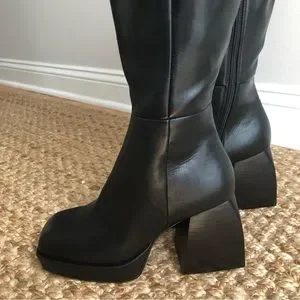 These Jeffrey Campbell heeled boots feature a sleek black leather design with a contemporary square toe and a chunky block heel. The minimalist style and medium shaft height make them versatile for both casual and dressier occasions.