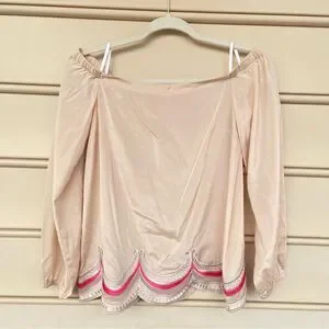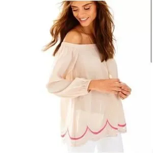 Lilly Pulitzer Silk Cream Blouse with Pink Scalloped Edges (Off the Shoulder)