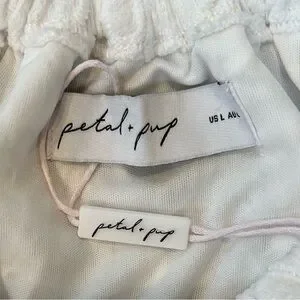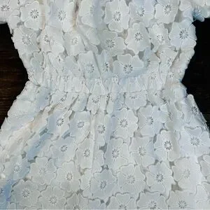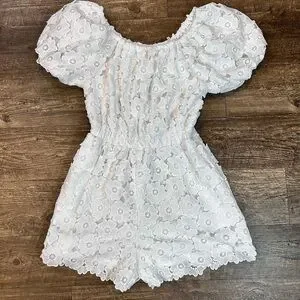 Step into elegance with this Petal & Pup white lace romper, showcasing intricate lace detailing and charming off shoulder puff sleeves. The elastic waistline ensures a flattering fit, while the scalloped lace trim adds a romantic touch to the shorts-style cut. Perfect for any occasion, this romper combines style and comfort effortlessly.