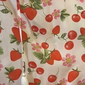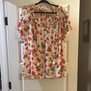 Embrace a relaxed style with this Rose & Olive blouse, featuring flutter sleeves and a charming tie front. The white and red color palette, adorned with a playful strawberry print, adds a fresh and summery touch to your wardrobe.