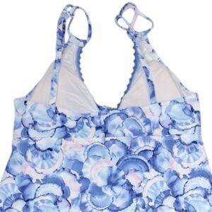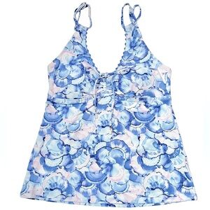 Embrace elegance with this blue and pink tankini top for sunny days at the beach. 95% recycled nylon, 5% spandex.