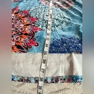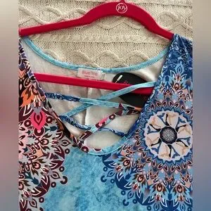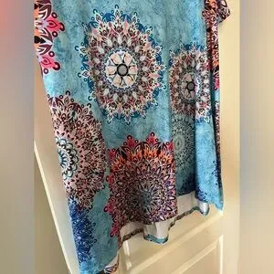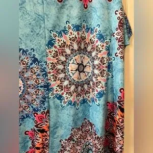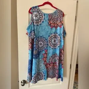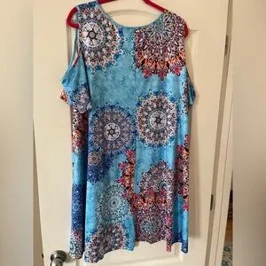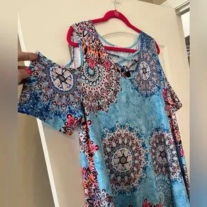 NWT brand new, excellent condition & quality. Boutique brand. Turquoise with mixed colors. Cold shoulder, short sleeve. Measurements in photos. Flowy. Summer dress. Polyester, cotton & spandex. Women’s size 3X. Smoke free home