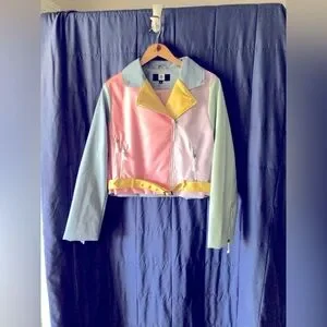 This varsity jacket showcases a delightful blend of pink and blue, capturing a retro-inspired aesthetic. Its sporty silhouette and lightweight design make it a versatile addition to any casual wardrobe.