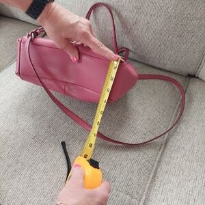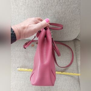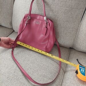This Coach shoulder bag in a delightful pink hue features a structured design crafted from smooth leather. The bag is equipped with both a top handle and an adjustable shoulder strap, offering versatile carrying options. Its silver-toned hardware adds a touch of elegance to its overall appearance. signs of wear. gently used