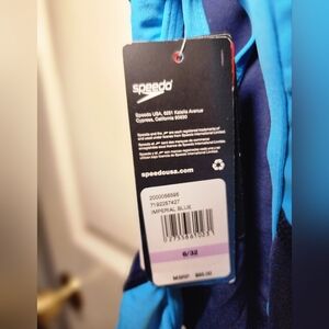 Stylish one-piece swimsuit by Speedo. Features a sleek black design with blue accents. Perfect for swimming and water activities.