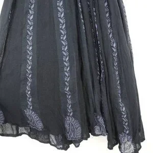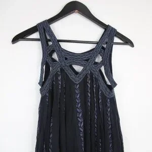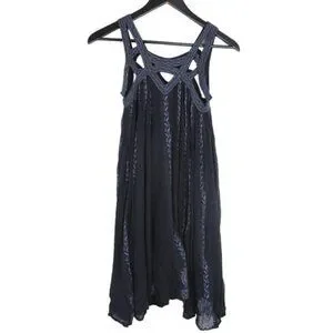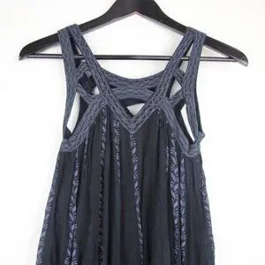 Flowy black sleeveless tunic dress in a gauzy, crinkly crepe. Features striking cutouts around the neckline, embellished with subtle embroidery that complements the grey vertical vine pattern. 100% cotton. Lined. Made in India.