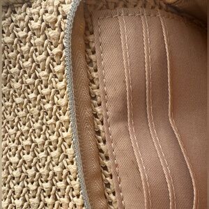 Material: Double layered raffia material, Vegan leather trim, Zinc Alloy Hardware, Nylon coil zipper