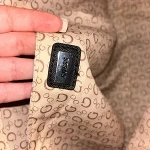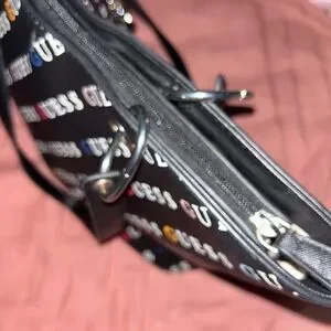 This Guess tote bag features a striking black and red monogram design, accented with small red heart details. Crafted from durable materials with black leather trim, it offers a structured shape and a secure zipper closure, making it both stylish and practical for everyday use.