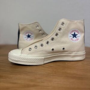 The Converse Comme des Garçons High Tops are a stylish and modern take on the classic sneaker. These high top shoes feature a beige colorway that adds a touch of sophistication to any athletic outfit. With a unique design from the Comme des Garçons Play collection, these sneakers are a must-have for fashion-forward men looking to make a statement.
