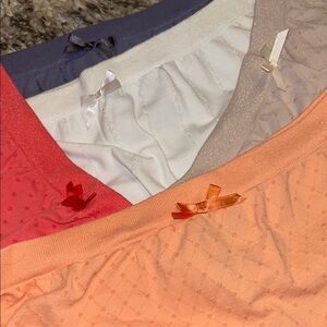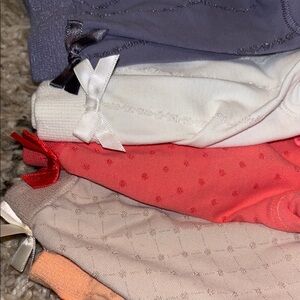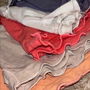 Set of five pajama shorts. Includes orange, purple, white, and cream colors.