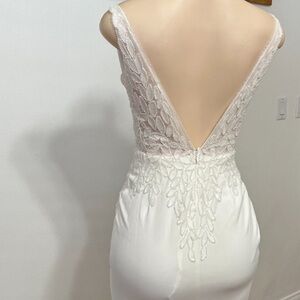 Impress all your guests as you glide down the aisle with this dazzling dress! Sheer mesh fabric is embellished with shiny white beaded details that create a floral-inspired design across the sleeveless bodice (with padded cups), a flirty V-neckline, and slender tank straps. The eye-catching design continues past the fitted waist, that sits atop a stretchy knit skirt; boasting a flattering mermaid-style silhouette as it cascades down to a sweeping maxi hem with an elegant train at the back. Hidden back zipper/clasp.