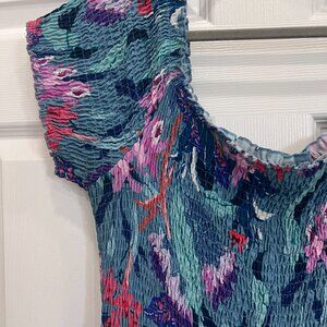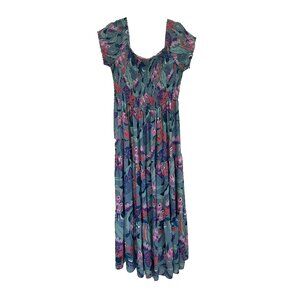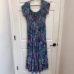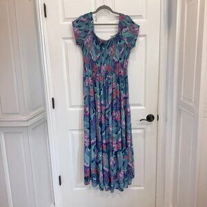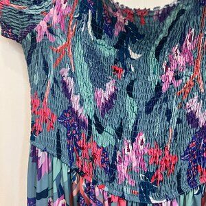 Beautiful aqua blue maxi dress from City Chic in Plus Size 18. Has this amazing smocked bodice that's super comfortable and flattering - you can really see the detail in the shirring. The floral print has pinks, purples, and coral mixed in with the aqua blue base. Super gorgeous in real life!