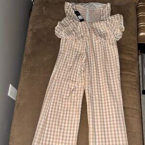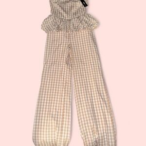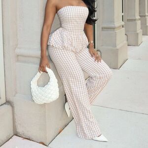 Brand new with tags! This Fashion Nova strapless gingham jumpsuit is the ultimate mix of playful and polished. Featuring a ruched bodice, flouncy waistline, and wide-leg fit in a neutral tan plaid. Perfect for brunch, vacations, wine tastings, or spontaneous flings in Italian vineyards (jk… unless? 🍷).