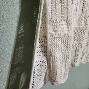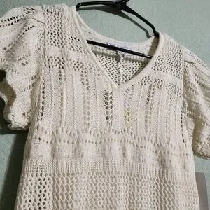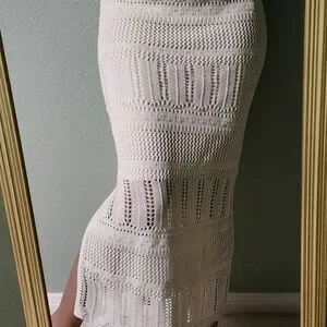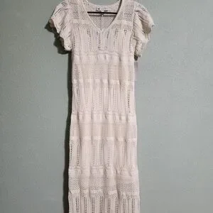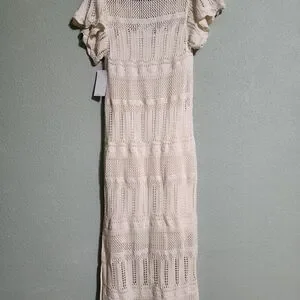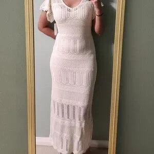 This cream crochet maxi dress offers a perfect blend of style and comfort. Ideal for any occasion, it features a flattering fit and intricate boho knit design. Wear it with or without the detachable lining (secured with buttons as seen in the last photo) as a cover up. The dress is brand new with tags and fits as a size extra small.