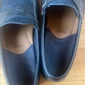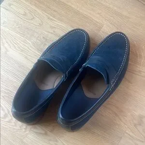 Elegant navy loafers with classic stitching. Comfortable slip-on design. Perfect for casual or formal wear.