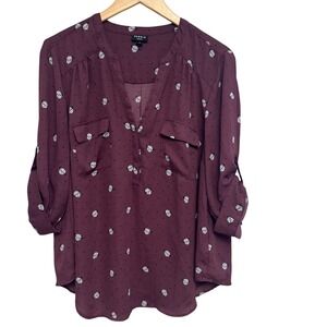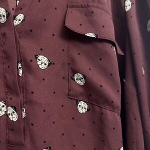 Keywords: Torrid, Harper, Blouse, Top, Pug Dog Print, Roll Tab Sleeve, Plus Size, Womens, Casual, Burgundy, Animal Print, Collared, Button Down, Pocket