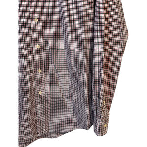 This Ralph Lauren Button Up Shirt for men in size M features a classic red, white, and blue check pattern made from cotton with added stretch for comfort. The collared neckline with a button-down style and embroidered accents make it suitable for various occasions including casual, formal, and business settings. Easy to care for with machine washable instructions, this shirt is perfect for all seasons and offers a timeless appeal with its classic design and breathable fabric.