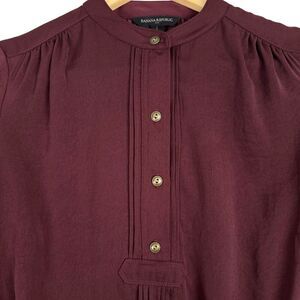 Features: Banana Republic burgundy shirt dress. Fabric is a lightweight satin polyester, it has a very slight sheen and texture to it. Unlined. Front has pleating detail and buttons as a closure.