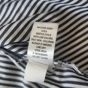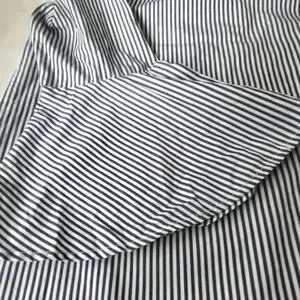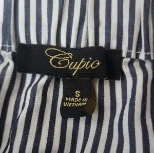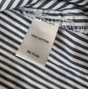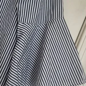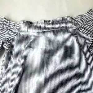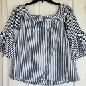 This stylish blouse features an off-the-shoulder design in pin stripe dark navy and white with statement flare sleeves. The wide elastic top band measures 19 inches across. Cotton fabric and relaxed fit make it perfect for casual or work wear.
