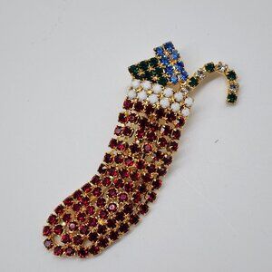 Christmas Stocking Figural Brooch Rhinestones Presents Candy Cane 2.5" VTG