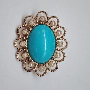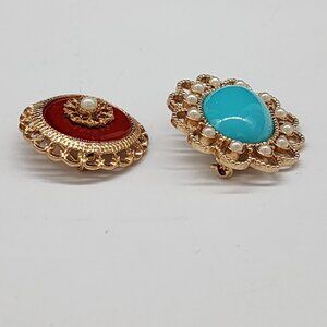 This vintage lot of 2 includes a Sarah Coventry Westminster Brooch and an Oval Blue Cabochon Brooch. The blue cabochon brings a pop of color, making these unisex brooches stand out.