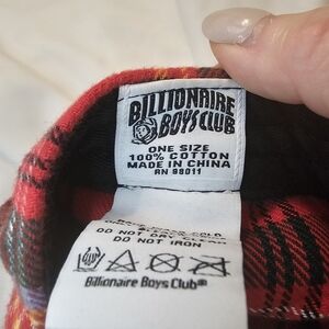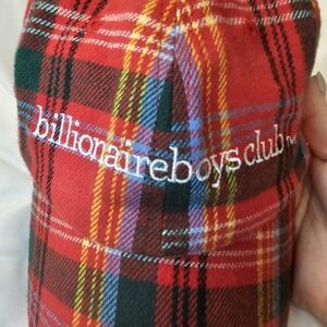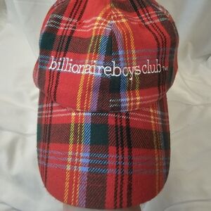 Stylish red plaid cap by Billionaire Boys Club. Features a bold plaid pattern with embroidered logo. Adjustable. Pre-loved ❤️♻️