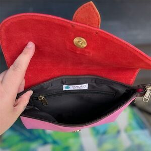 Stand out from the crowd with this gorgeous Soruka color-block bag! Featuring vibrant pink and red hues with a lime green accent, this sustainable and unique handbag is in excellent condition. Comes with an adjustable strap and a secure magnetic closure. A perfect accessory for adding unique flair to your style!