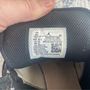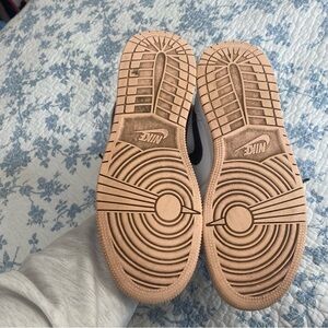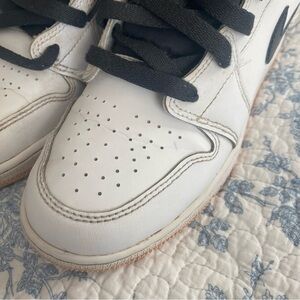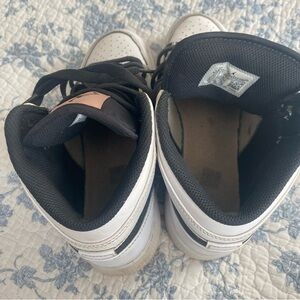 This is a pair of Nike Air Jordan 1 Mid Arctic Orange sneakers. The size is 6Y. In gently used condition. One small blue mark on the front as pictured. Aside from that, they are in good condition.